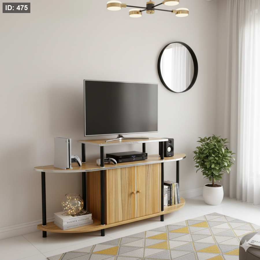 جدّد صالونك وخلّي الفخامة تحكي! ✨ وصلت طاولة التلفزيون المودرن اللي بتخطف العين بتصميمها الدائري ولمسات الكروم! 📺 القياسات: عرض 130، ارتفاع 70، وعمق 50.. خشب نخب أول بعيش العمر!